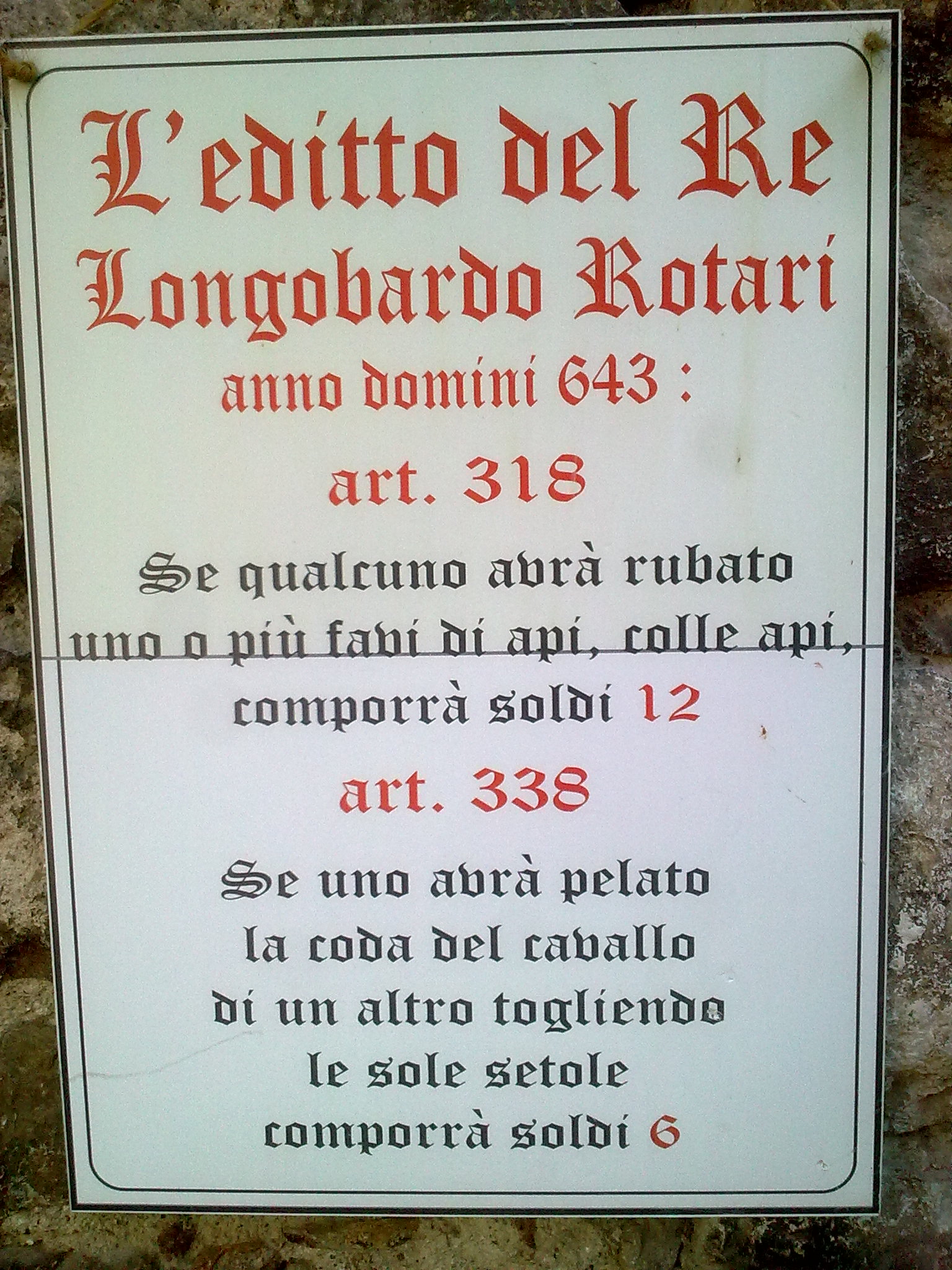 Pedalando di ritorno da una “scalata” in bici con mio nipote Enrico da Riva del Garda a Balbido , il Paese Dipinto, detto così per via dei suoi splendidi murales, arrivato al Lago di Tenno ho fatto una deviazione a sinistra e sono andato a Canale di Tenno, splendido paesino medievale arroccato sulla montagna, un museo a cielo aperto: le vecchie case manutenzionate (il termine “ristrutturate†farebbe pensare ad un intervento snaturante, il che non è), le viuzze acciottolate e le insegne dei mestieri medievali … poi, in una piazzetta, affissa alla parete, una ordinanza del sindaco … ops, scusate, un estratto dell’editto del Re Rotari, capo dei Longobardi, all’epoca dominatori della zona. Si tratta di un intervento molto specifico a fronte di specifici “reatiâ€: furto di favi e di api e furto delle setole della coda dei cavalli.