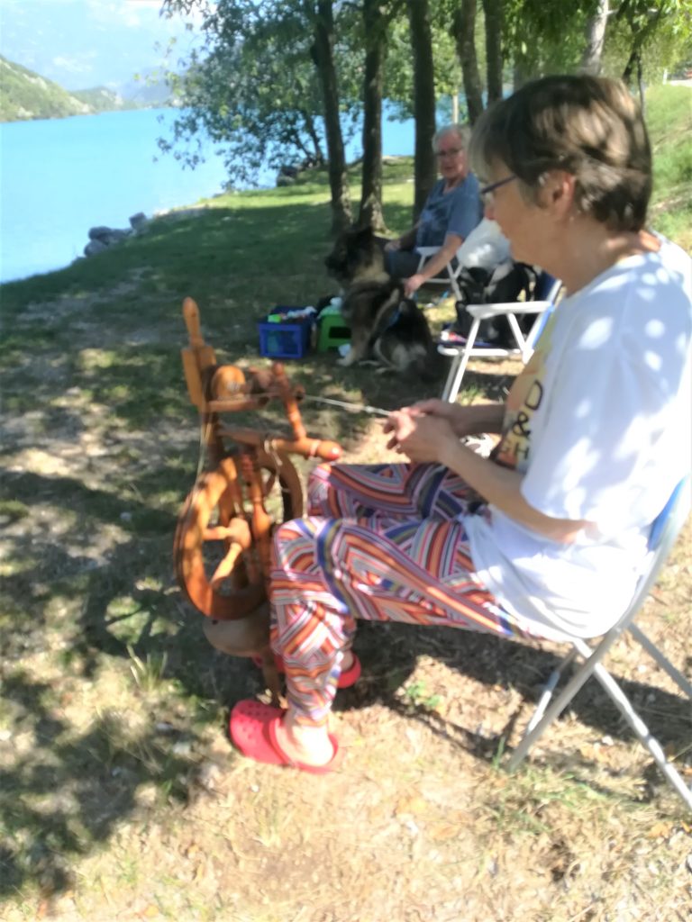 Mi fermo a fotografare – previo permesso: “Darf Ich …? la Lei di una coppia di sposi tedeschi: lui seduto, legge un libro; il suo cane mi fa festa; la gentile signora fila la lana su di un vecchio arcolaio in legno!