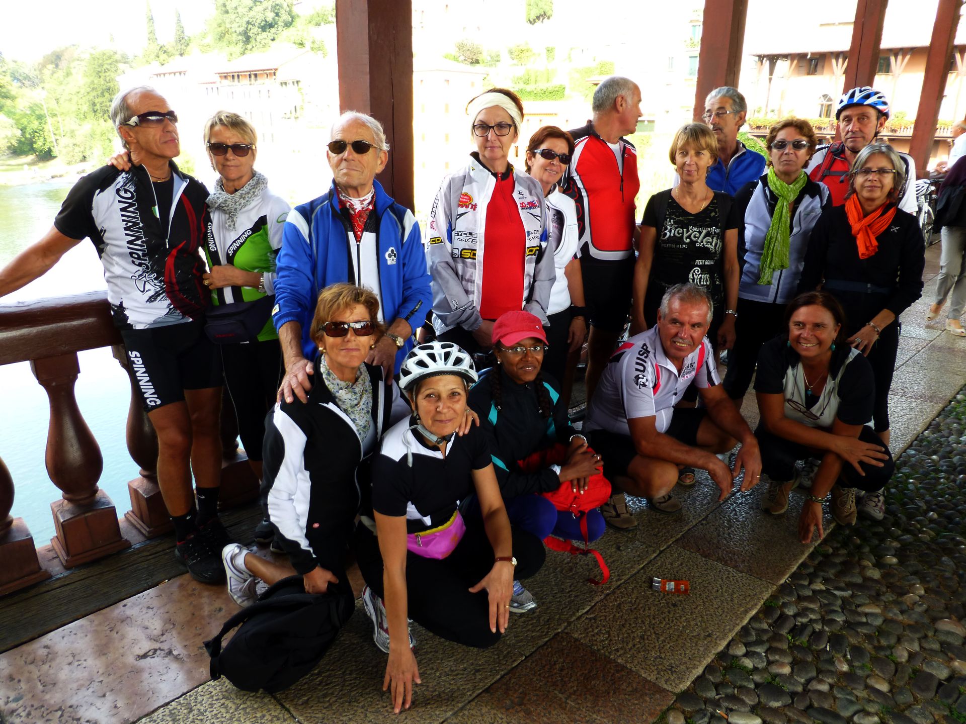 Domani, domenica 23 settembre, la Valsugana da Levico sino a Bassano del Grappa. 75 km con il gruppo BICI UISP di Trento. In bicicletta …. naturalmente! E difatti, ecco una parte del Gruppo sul famoso ponte di Bassano: