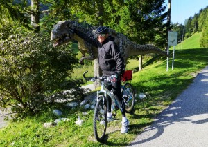 Breve sosta con foto a fianco di una vecchia casetta, quindi ci caliamo della valle “dei dinosauriâ€: infatti poco prima del paese di Unsere Liebe Frau Im Walde (Senale) faccio amicizia con uno di loro!