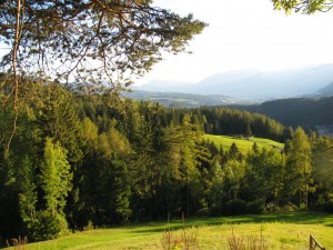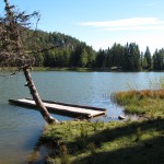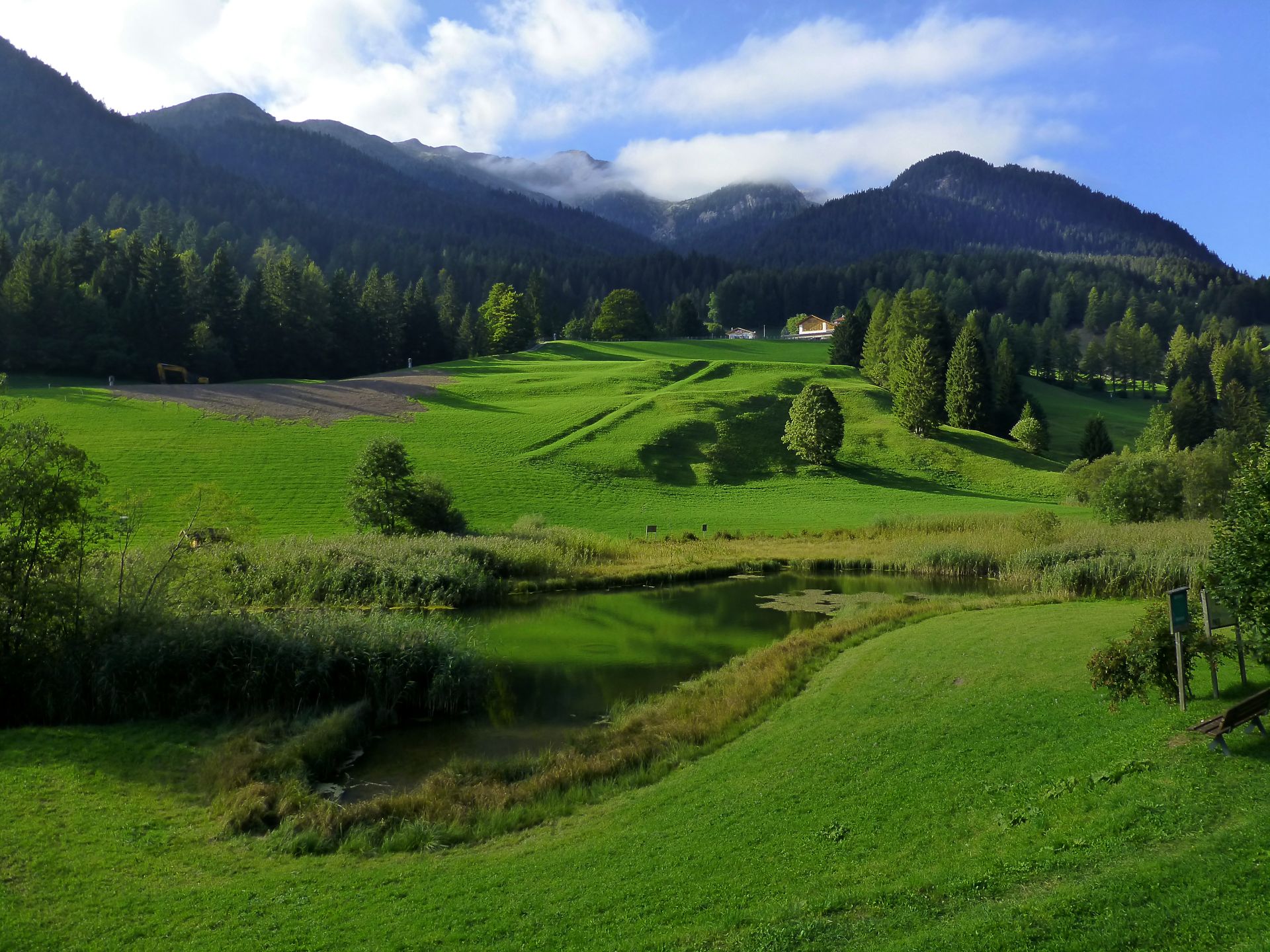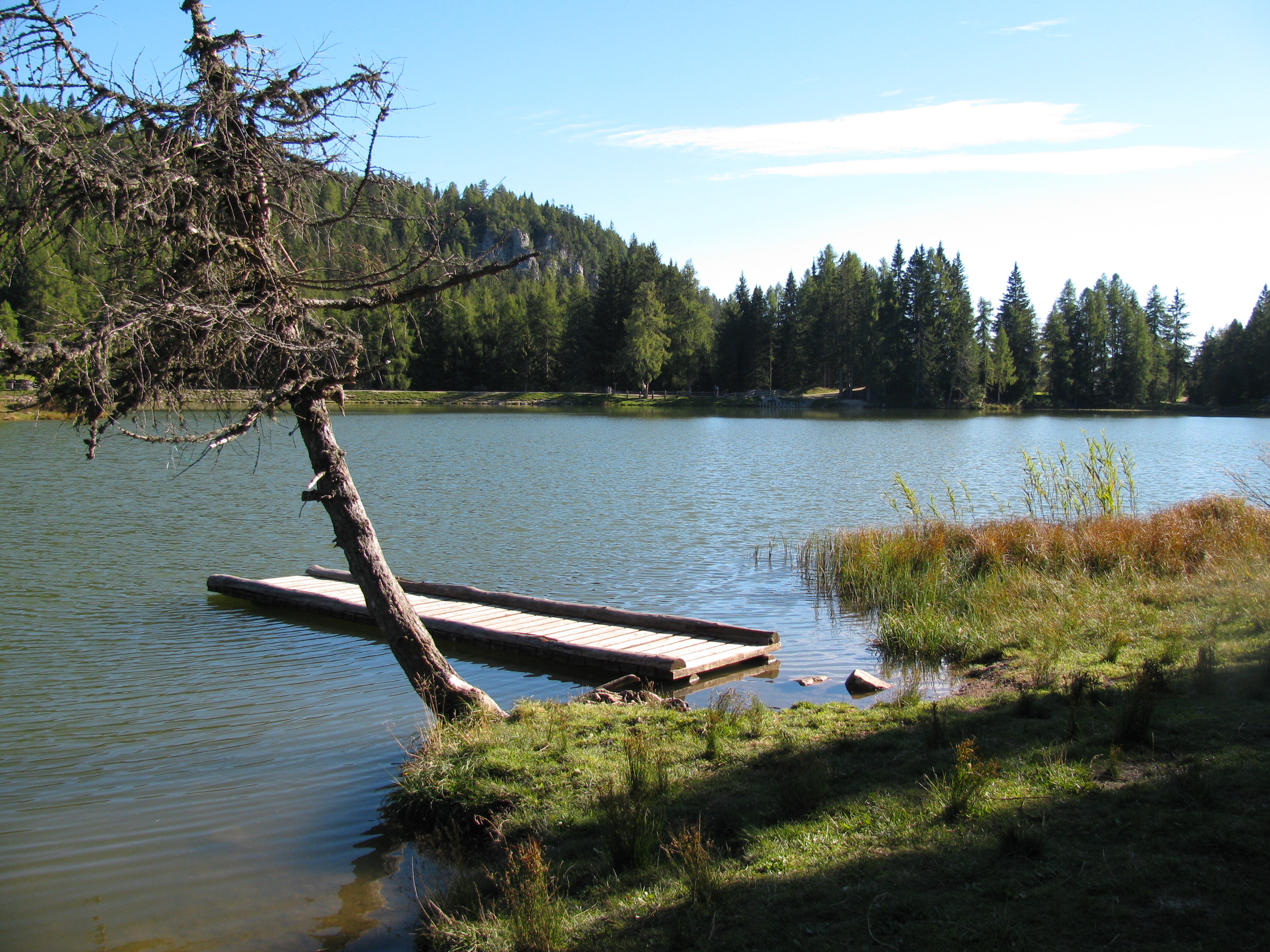 Già che ci siamo, a raccolta terminata, ci spingiamo sino al Lago. E’ un laghetto artificiale, ma quasi non ci se ne rende conto, tanto è bello. Azzurro del cielo. Tutto il resto, verde.  Nella zona tedesca il bosco è curato come un giardino. I prati rasati, spesso addirittura dotati di impianto di irrigazione. Mucche pezzate di marrone al pascolo.