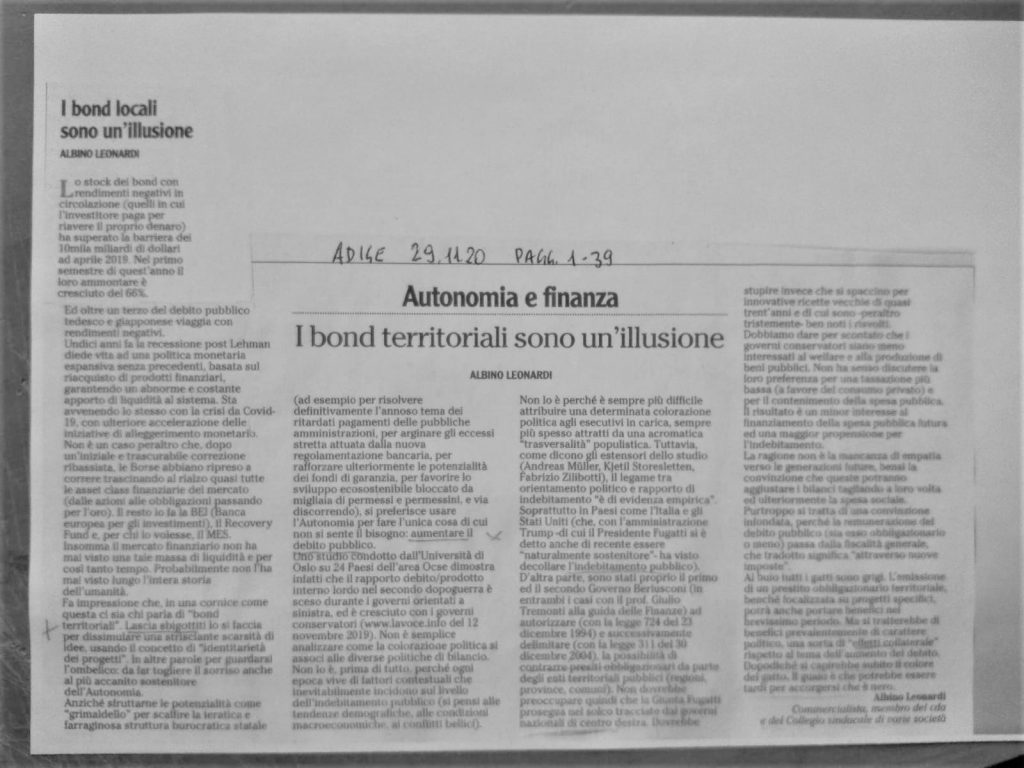 pubblicato da: Riccardo Lucatti - 29 Novembre, 2020 @ 4:20 pmA seguito dell’intervento di Albino Leonardi su l’Adige 29.11.20 pagg. 1 e 39 (post 4080)