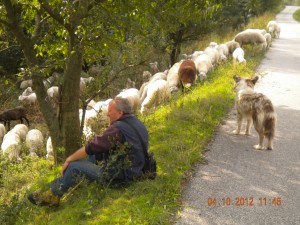 Km 17,5: bicigrill di Nomi. Caffè e brioche con marmellata. Indi si riparte. Prima di Borghetto vecchi muretti e un gregge di pecore Sosta per foto all’Adige ed alle pecore.