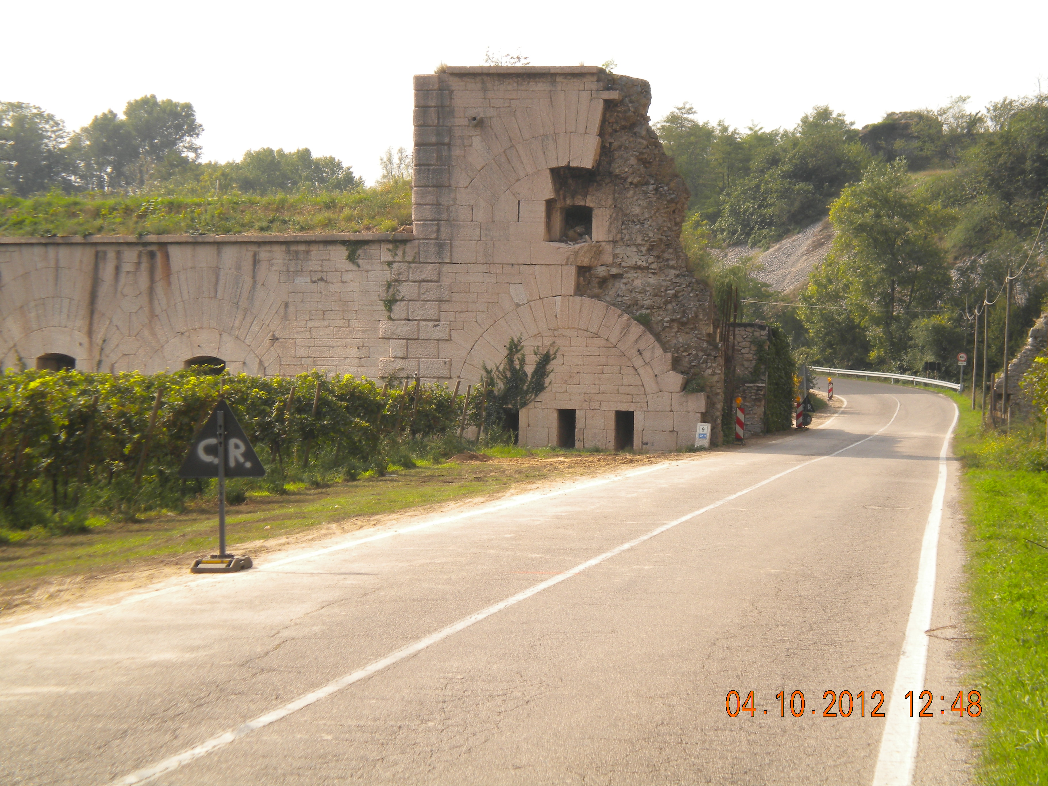 Quindi, superato quello che un tempo era uno sbarramento fortificato della strada,  inizio a salire sulla statale. 7 km di salita dura (8%): per fortuna ho la mtb con i suoi meravigliosi rapporti demoltiplicati! Con la bici da corsa sarebbe stato molto più dura! A metà salita, un bivio: domando informazioni circa la strada per Garda. Mi suggeriscono di scollinare a Caprino Veronese. Errore: avrei potuto aggirare la salita resuidua verso sud! Chi non ha testa ha gambe! Ecco cosa vuol dire aver dimenticato a casa la mappa che mi ero diligentemente preparata! Arrivo finalmente al pianoro sul quale si trova  Caprino.