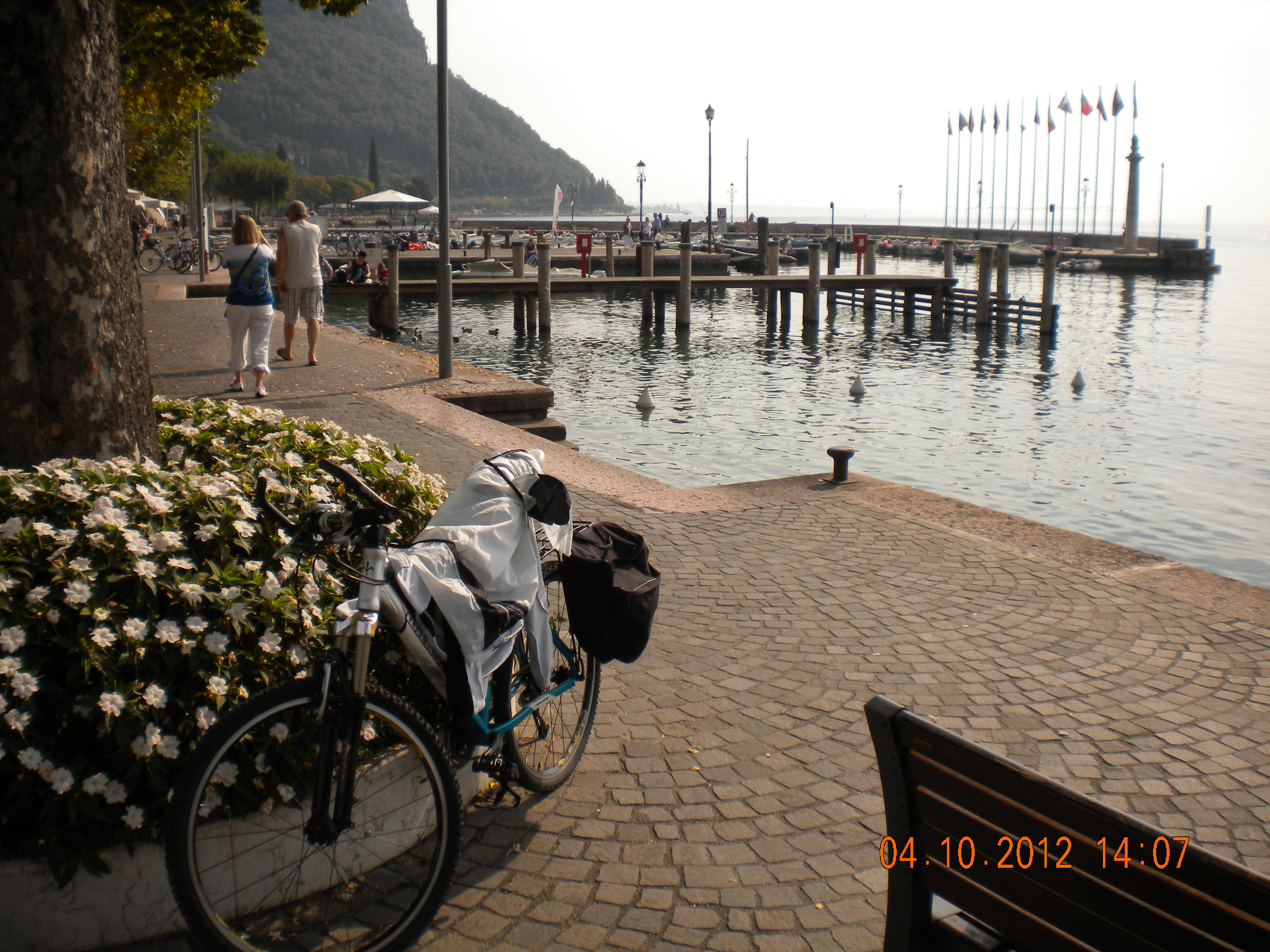 A Riva, a Riva! A Riva … del Garda, in bicicletta!  Ci arrivavo sempre da nord, provenendo da Trento. Questa volta ho voluto arrivarci da sud, un po’ come il mio compaesano Cristoforo Colombo che voleva “guadagnar l’oriente par l’occidente ….â€Â Innanzi tutto, quale bici usare? Quella da corsa scivola meglio e pesa meno, ma non ha il portabagagli. E, potendo, preferisco non avere un sacco sulle spalle. Quindi prendo la mtb.