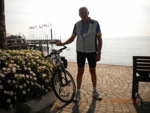Lo aggiro verso sud … troppo verso sud (secondo errore di rotta) ed arrivo a Albarè, in zona da ma conosciuta. Risalgo verso nord per 2 km, indi a sinistra scavalco la collinetta, scollino e finalmente sono in cima al discesone che conduce a Garda. Zà latta, zà latta, il mare, il mare! Gridarono i Greci delle Anabasi di Senofonte al termine della loro faticosissima marcia! Il Garda e il paese di Garda, finalmente! Arrivo al lago alle 14,00, poco più di cinque ore per 90 km, soste per caffè, foto e ricerca itinerario  comprese.