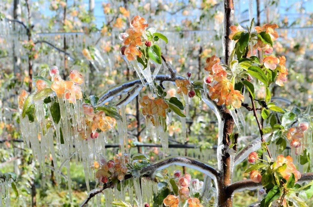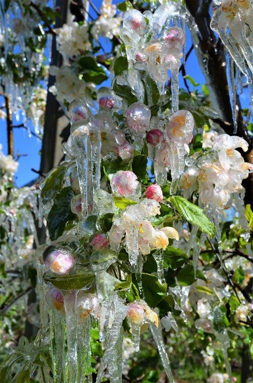 Sulla ciclabile verifico il vento: pedalo con il vento alle spalle alla velocità di 10 kmh e non lo avverto: la previsione era corretta! Pedalo a 26 kmh, vento in poppa! Oggi ho la e-mtbike (pesa 25 kg!), ma a 25 kmh il motore si esclude automaticamente. Resto sulla destra (orografica) Adige, la meno frequentata, in molti tratti sterrata. Alla mia sinistra, l’Adige. Alla mia destra i frutteti fioriti e … tutti bianchi di ghiaccio! Infatti per preservarli da maggiori danni i contadini li hanno annaffiati creando loro una coperta di ghiaccio che impedisce che siano danneggiati i fiori. Scatto alcune foto, ma il mio telefonino non le fa bene, vedo un tale con la macchina fotografica, gli chiedo se cortesemente me ne manda qualcuna delle sue. Dice di sì. Ringrazio e proseguo fini al Bicigrill di Nomi, chiuso e deserto. Breve sosta, riparto verso nord e questa volta sì che l’aiuto elettrico mi vien bene, con quel vento contrario! Grazie, e-bike, che dai una mano ad un ciclista “77enne controvento”!