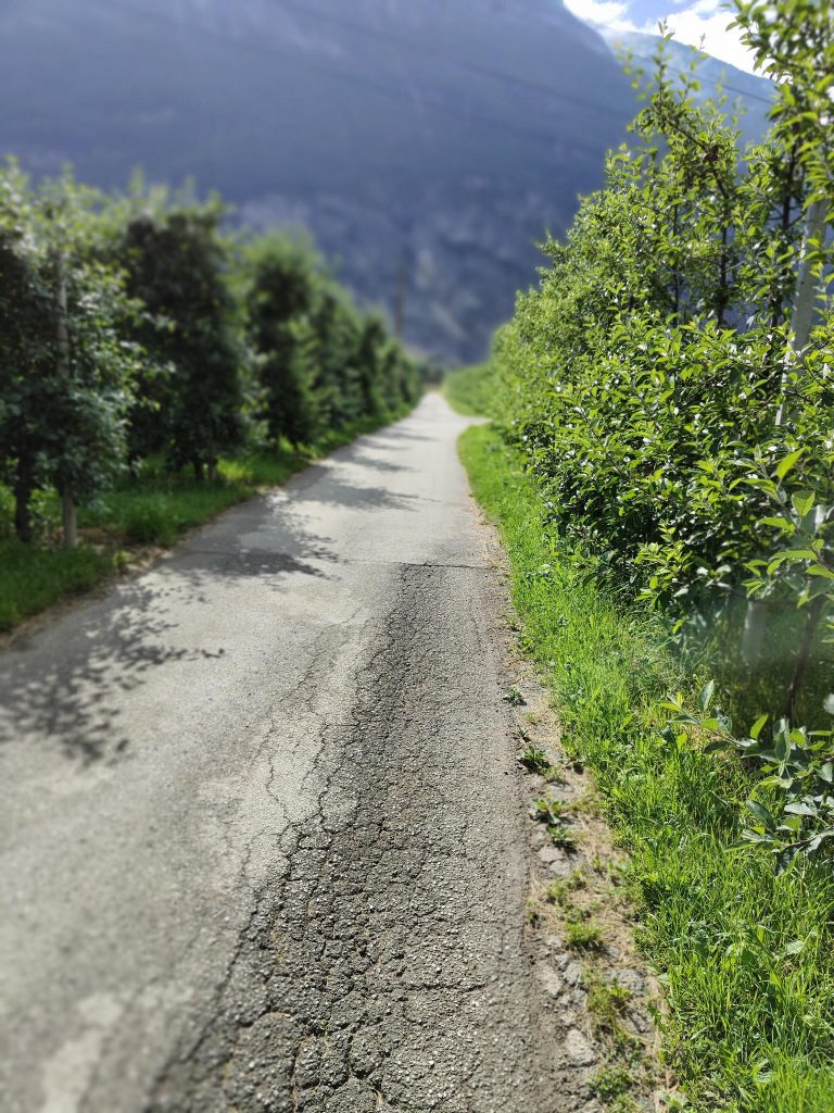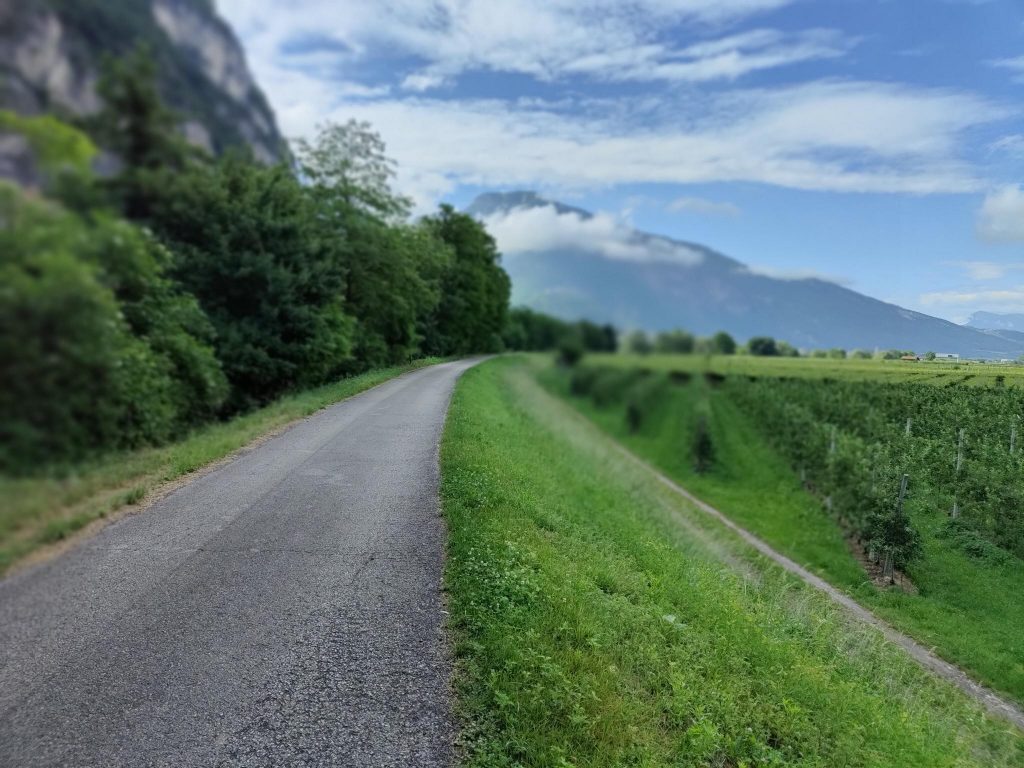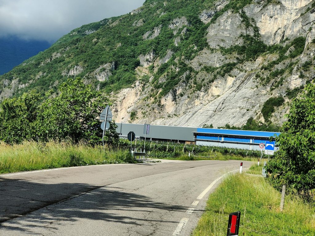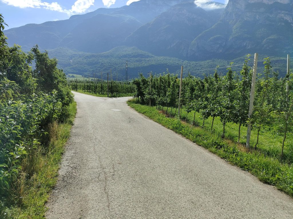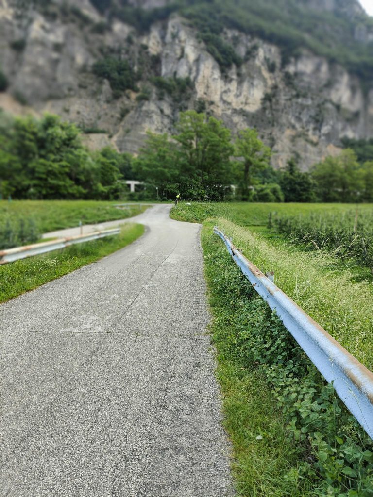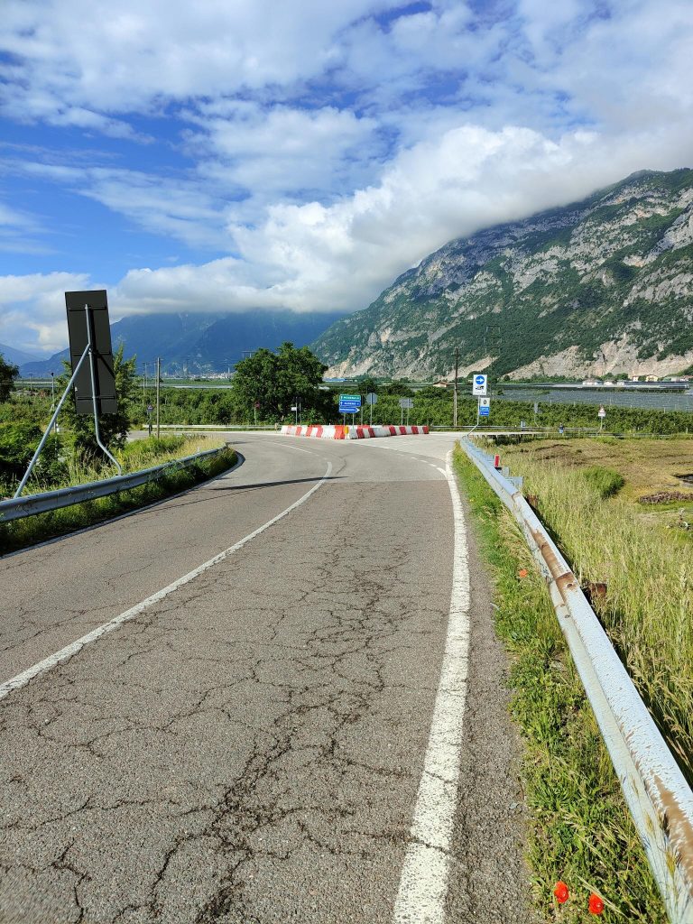 Da Trento verso sud, sulla ciclabile. Arrivato all’altezza di Mattarello, lascio la ciclabile, volto a destra sulla SP, scavalco l’Autostrada e mi si presenta il primo bivio qui sotto: prendere a sinistra (km 0):