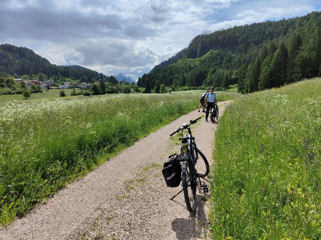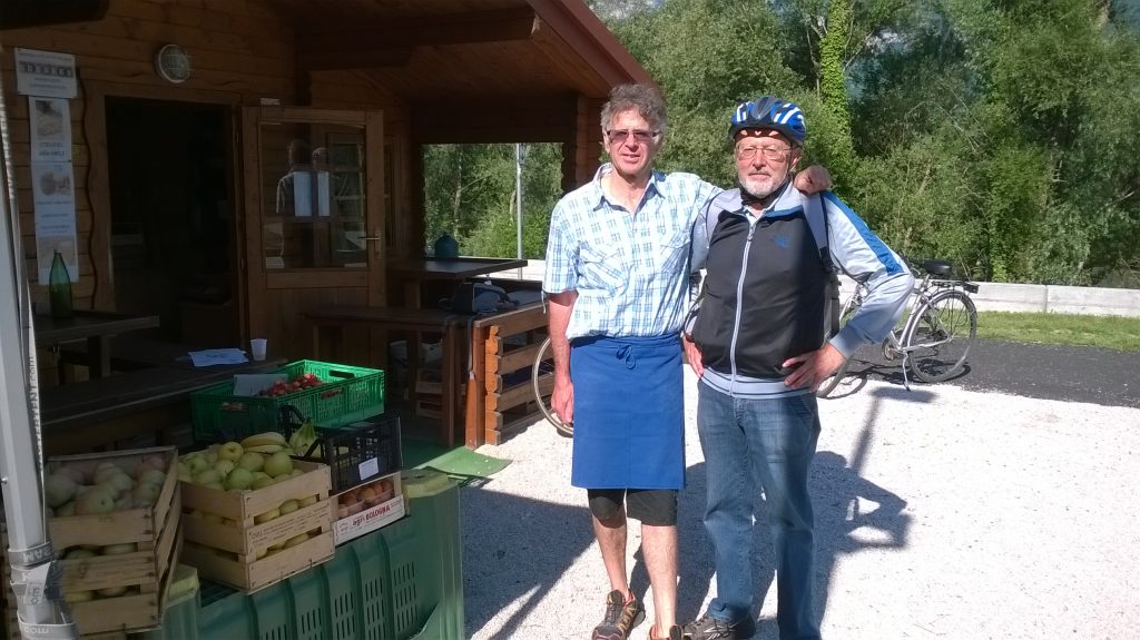 Giovanni, Claudio ed io. Si esce dall’A22 ad Ora, ci si dirige verso nord e dopo soli 300 metri di SP, a sinistra, il piazzale di parcheggio con il chiosco dell’ormai amico Otto e poco più avanti un quasi bicigrill. Otto ormai è un amico: ci incontriamo da anni, ogni anno: quattro chiacchere anche in tedesco, succo di mela, frutta fresca, un consiglio sulle nuove ciclabili, sul tempo.