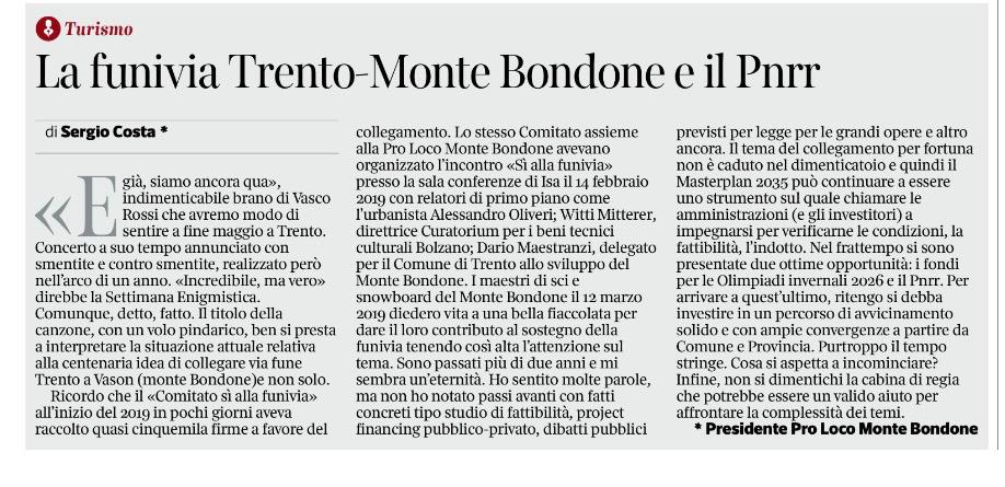 pubblicato da: Riccardo Lucatti - 14 Dicembre, 2021 @ 5:00 pmEgregio Direttore, mi riferisco all’interessante contributo di Sergio Costa in merito alla “sonnolenza” dalla quale pare sia afflitto il progetto della Funivia Trento-Vaneze (Monte Bondone), intervento sul quale concordo in pieno. Al riguardo mi permetto di sottoporre all’attenzione Sua, delle lettrici e dei lettori alcune sottolineature.