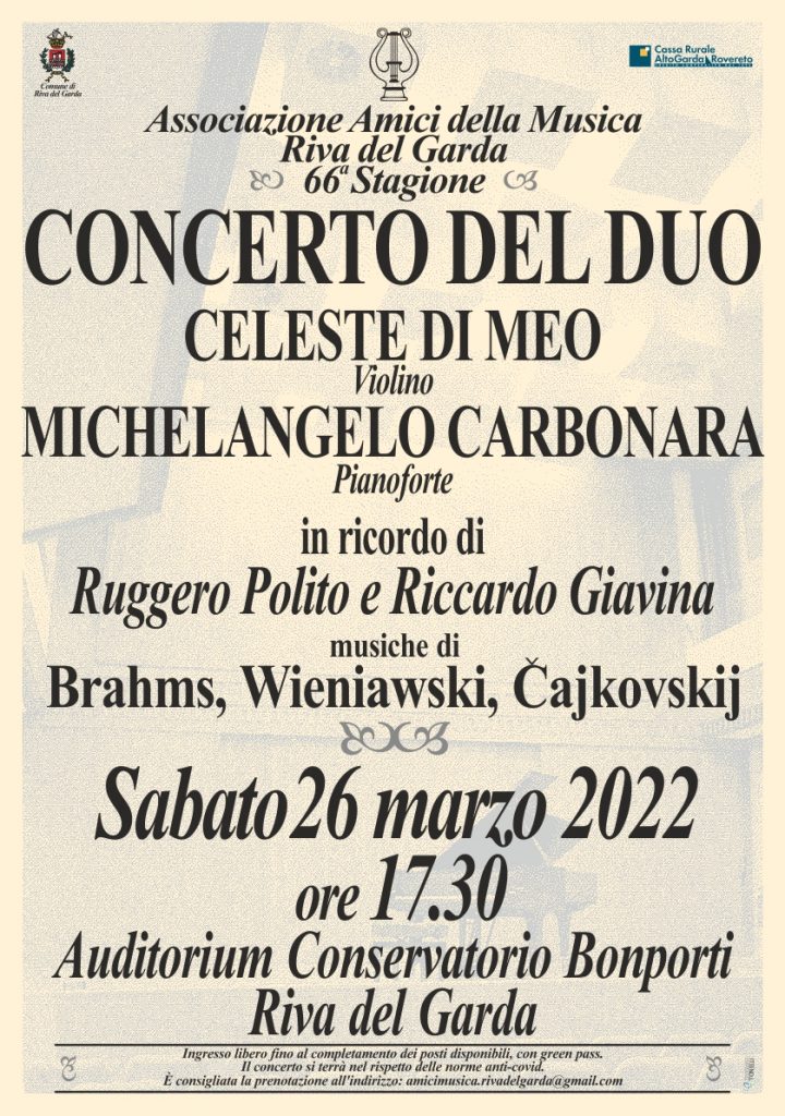 pubblicato da: Riccardo Lucatti - 27 Marzo, 2022 @ 7:17 amOgni anno un concerto in ricordo di Ruggero Polito e di Riccardo Giavina: due carissimi amici, Presidente e Vicepresidente dell’Associazione Amici della Musica in Riva del Garda.