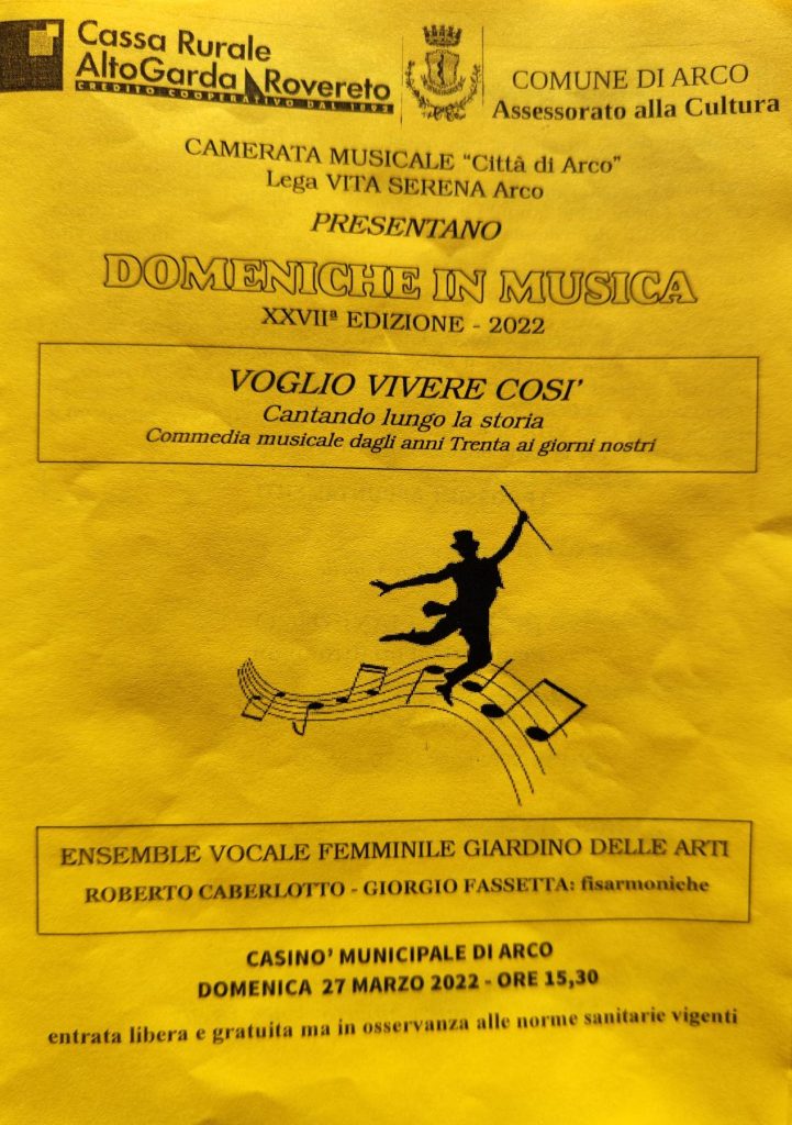 SEBBEN CHE SIAMO DONNE: questo il titolo che meriterebbe la rassegna canora (ma non solo!) di ieri pomeriggio “Voglio vivere così – Cantando lungo la storia” nell’ambito delle “Domeniche in musica” organizzate dalla Camerata Musicale “Città di Arco” presso il locale Casino.