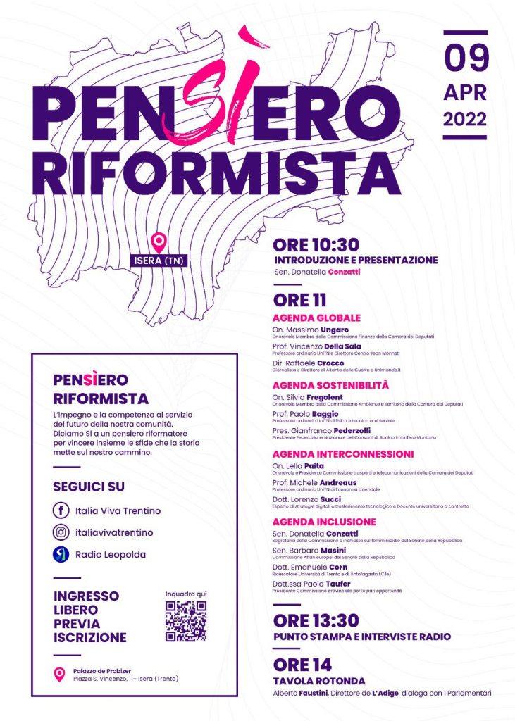 pubblicato da: Riccardo Lucatti - 4 Aprile, 2022 @ 11:29 amPer occuparsi della res propria, della res publica, quella che è di ognuno di noi, occorre occuparsi delle cose che la riguardano: siamo cittadini attivi, partecipiamo alla costruzione del Bene Comune, che è “quel Bene alla cui realizzazione hanno contribuito tutti, personalmente, sin dall’inizio”CONVEGNO A ISERA (TN), 9 APRILE 2022 ORE 10,30 – 15.30Clicca qui per conoscere il programma completo e iscriverti: donatellaconzatti.com/pensiero-riformista