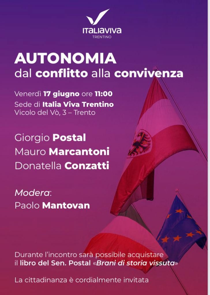 pubblicato da: Riccardo Lucatti - 15 Giugno, 2022 @ 1:53 pm| Sono lieta di invitarti ad un appuntamento con la storia e con il futuro dell’Autonomia, venerdì alle ore 11. Dialogheremo con il Senatore Giorgio Postal e con il Dott. Mauro Marcantoni per conoscere e capire la nostra Autonomia. Saremo guidati nelle riflessioni dal giornalista Paolo Mantovan, già autore di una inedita intervista a Enrico Mentana. Oltre alle voci di uomini illustri, farò sentire la mia voce di donna e Senatrice che vede e vive l’Autonomia anche da Roma. Avvertiamo oggi forte la necessità di rivitalizzare e riempire di prospettiva la nostra specialità. L’appuntamento è fissato per venerdì 17 alle ore 11 nel centro di Trento a pochi passi da Via Torre Verde. Ti aspetto, Donatella Conzatti |
