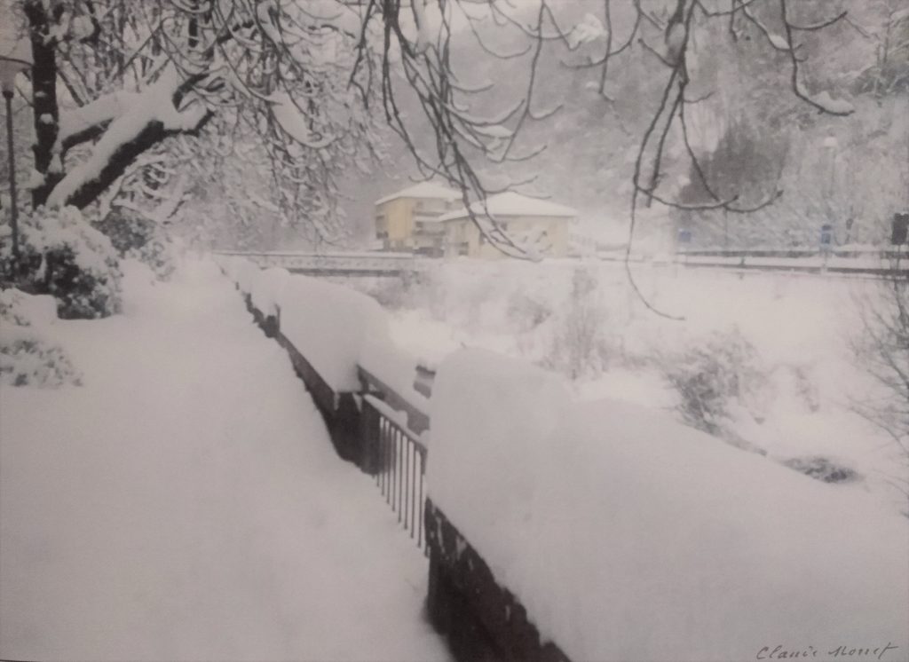 Inverno 2020-2021, impianti fermi causa Covid e – ironia della sorte – nevicate eccezionali anche in città, a Trento. Davanti casa mia, in Viale Trieste, lungo il fiume Fersina, a 900 metri dal Duomo, ho scattato una foto che poi ho “truccato” apponendoci la (ovviamente) falsa firma di Claude Monet.