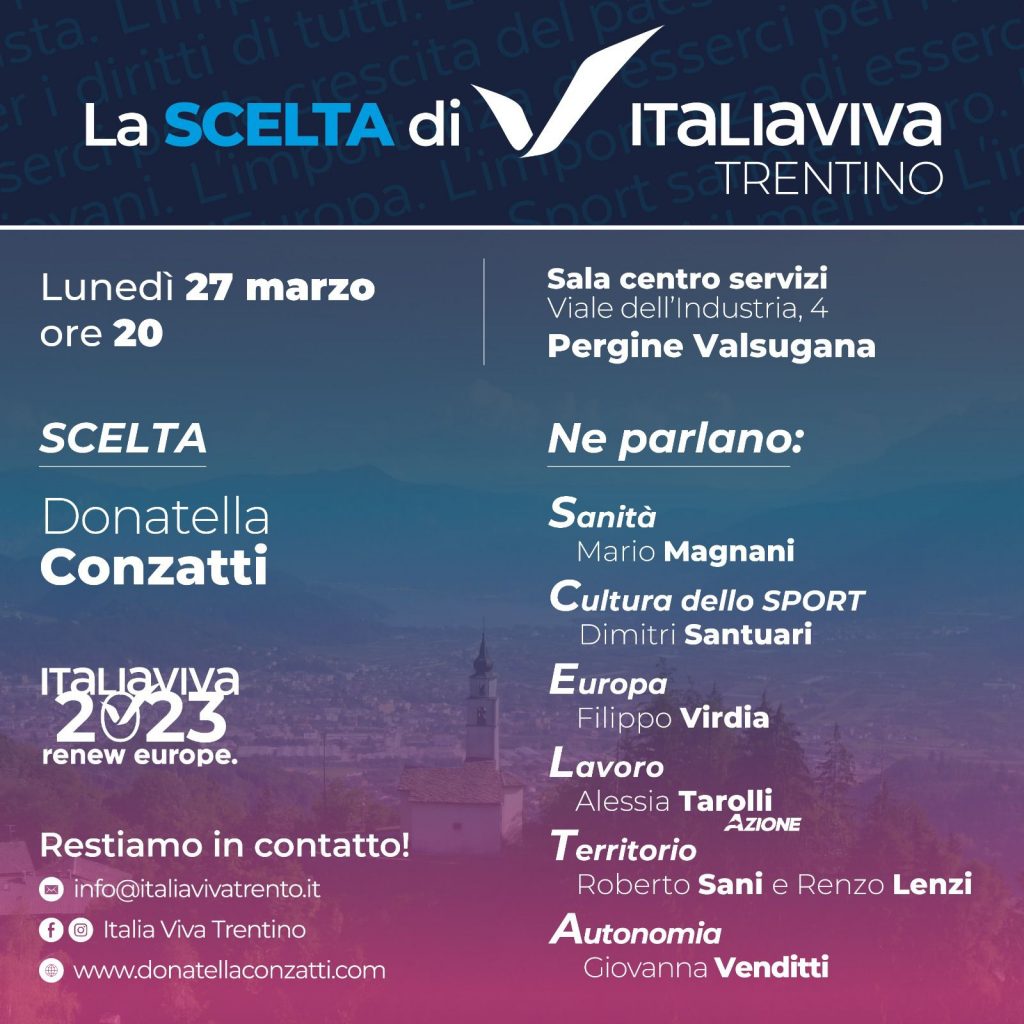 Last but not least, il 27 marzo prossimo, Pergine sarà la settima delle 14 tappe che noi di ITALIA VIVA stiamo percorrendo nelle valli trentine per portarvi la nostra SCELTA ma soprattutto per raccogliere le istanze delle popolazioni locali.