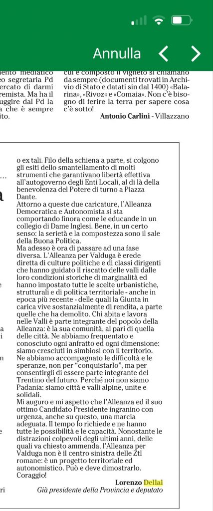 All’Adige sono abbonata, così come agli altri giornali locali e ad alcuni nazionali. Mi piace leggere le opinioni di tutti. Alcune non le condivido. Ma una manipolazione comunicativa di questo stampo la leggo e la vedo da molto tempo solo qui. Credo sia compito della nuova politica essere chiari. Continuate pure, ci mancherebbe. Ma sappiate che non è un gran servizio per chi legge inconsapevolmente. Chi vi legge consapevolmente invece “vi vede” arrivare.