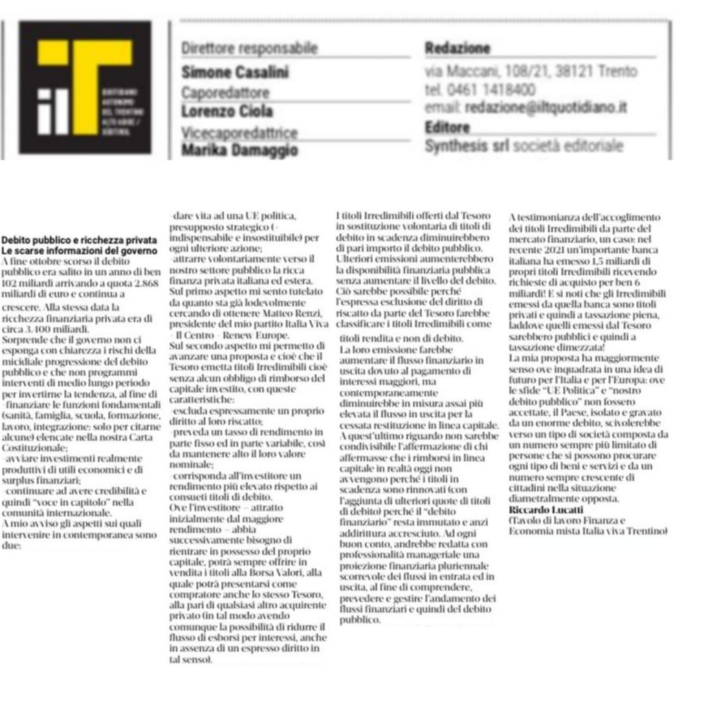pubblicato da: Riccardo Lucatti - 22 Dicembre, 2023 @ 9:32 amOggi il quotidiano trentino ilT ha pubblicato un mio contributo su debito e finanza pubblica, il cui testo trovate tre post fa sotto il titolo DEBITO PUBBLICO E RICCHEZZA FINANZIARIA PRIVATA e anche nella foto allegata.