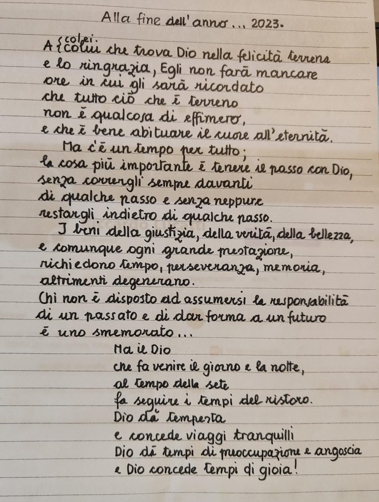 Marcello ha distribuito un foglio con le sue considerazioni per la fine dell’anno. Mi permetto di evidenziarne due:1) Dio non farà mancare nulla a chi lo ritrova già nella felicità terrena che non è una felicità effimera perchè abitua il cuore all’eternità;2) chi non è disposto ad assumersi le responsabilità di un passato e di DAR FORMA a un futuro, è uno smemorato (le lettere maiuscole sono una mia iniziativa).