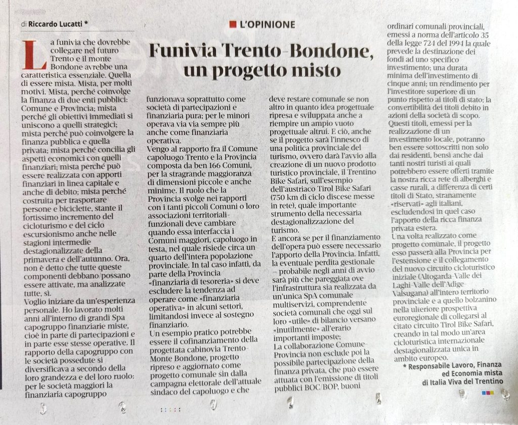 pubblicato da: Riccardo Lucatti - 26 Giugno, 2024 @ 10:15 amMentre lavoravo al mio Progetto Pesto, la stampa locale (quotidiano ilT- Trento) a pag. 3 pubblicava un mio intervento sul progetto Cabinovia Trento-Monte Bondone.