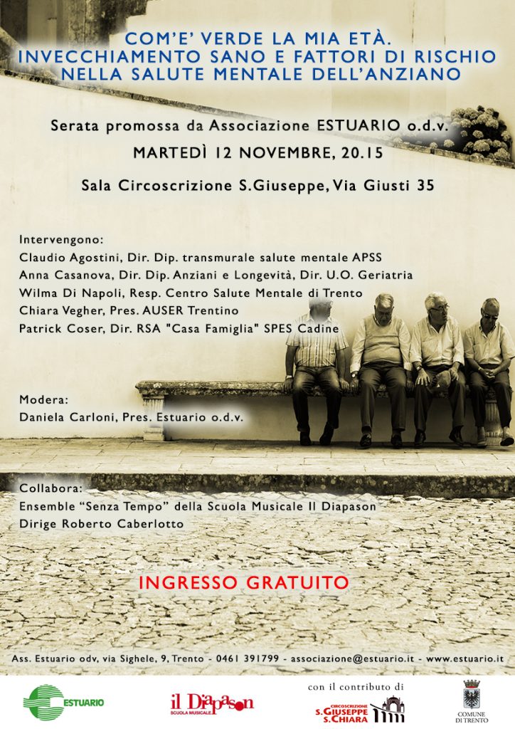 Per martedì 12 novembre, alle 20.15, nella sala circoscrizionale S Giuseppe in via Giusti 35, promuoviamo una serata dal titolo “Com’è verde la mia età. Invecchiamento sano e fattori di rischio nella salute mentale dell’anziano.”