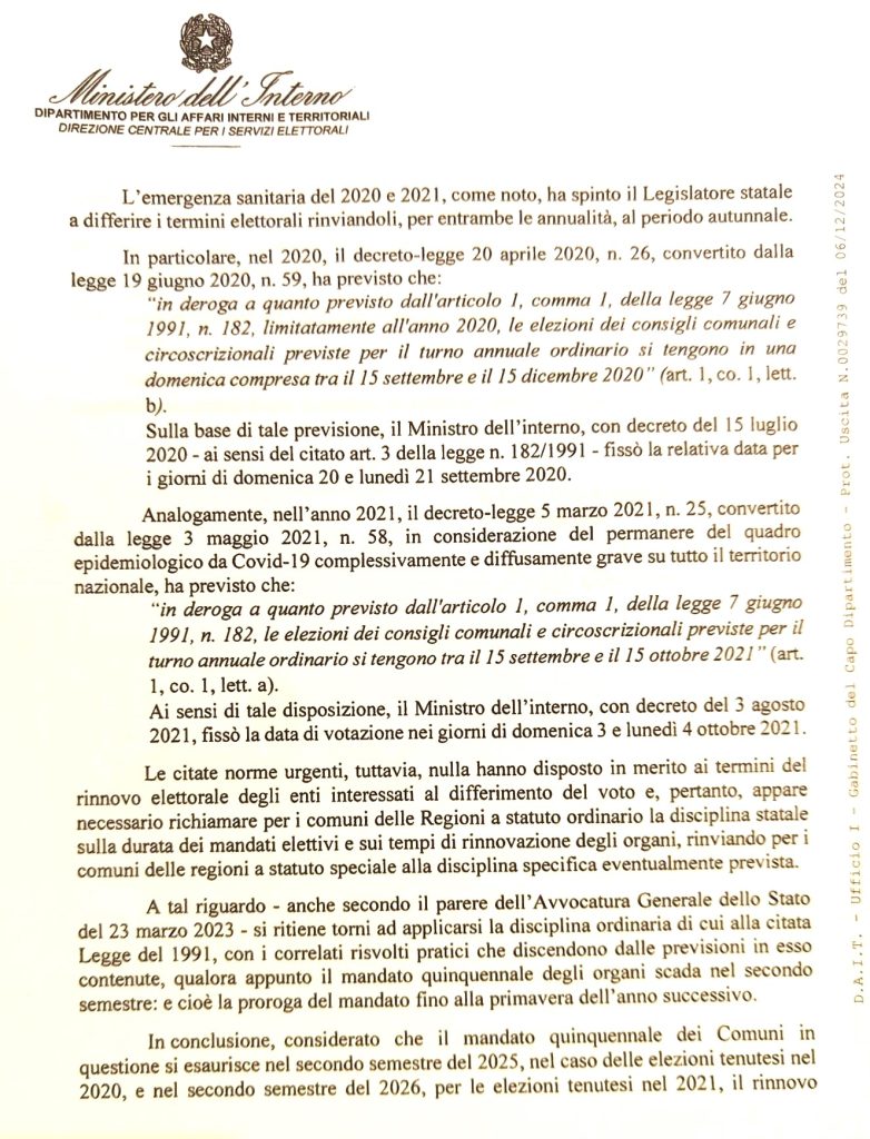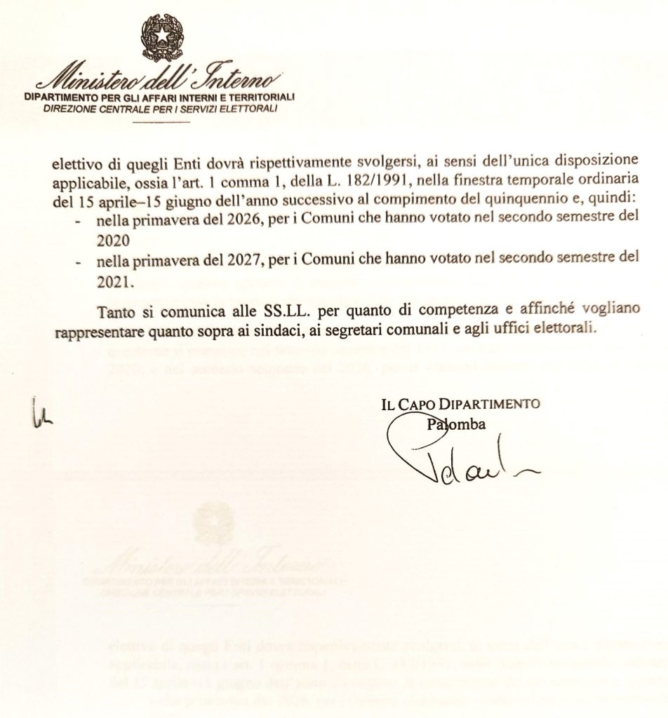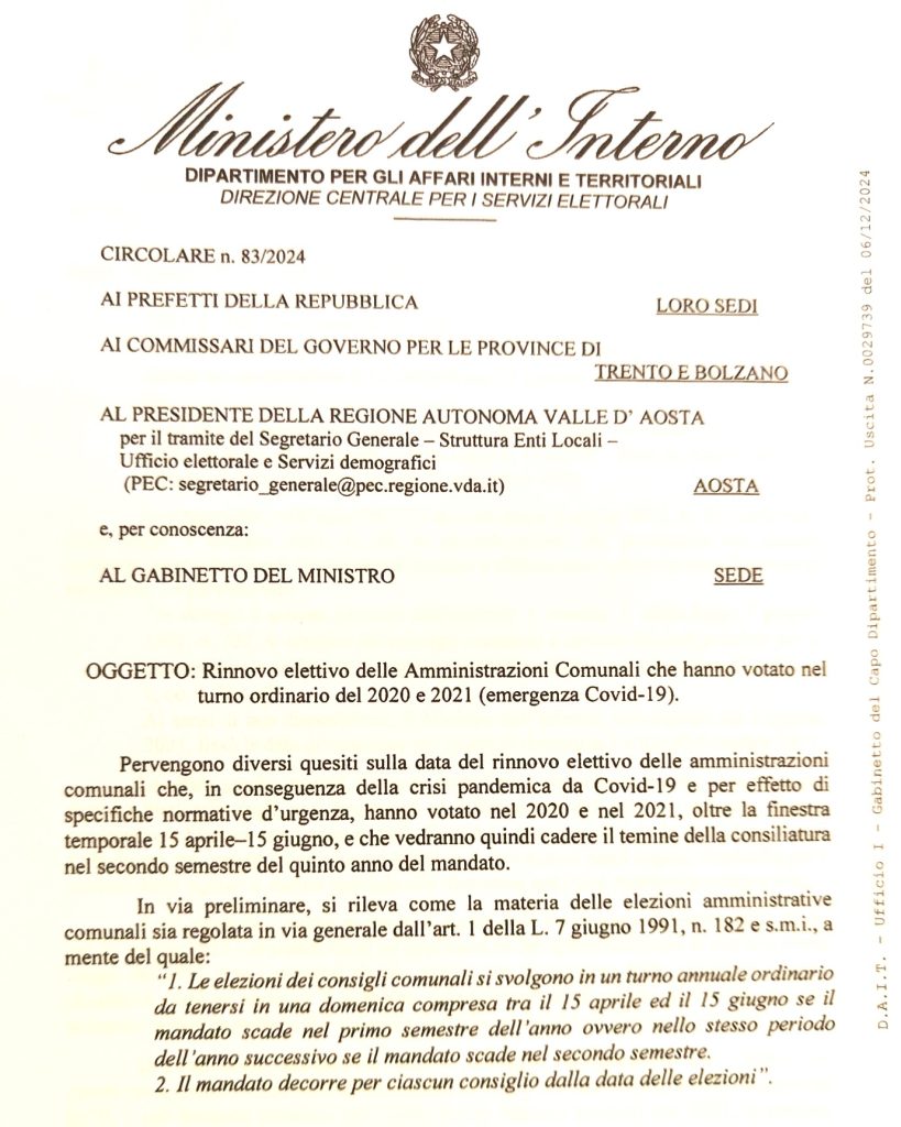 pubblicato da: Riccardo Lucatti - 9 Dicembre, 2024 @ 7:47 amLa Circolare n. 83/2024 su “carta intestata del Ministero dell’Interno”, firmata come dalle copie allegate da un/il Capo Dipartimento (Palomba), definisce le proroghe delle date alle quali si devono svolgere le prossime elezioni comunali nei Comuni delle regioni/province a statuto speciale, in modo diverso rispetto alle date fissate per gli altri Comuni, date regolate da precedenti leggi, decreti ministeriali, decreti legge, tutte disposizioni queste definite nel testo che sto citando come “norme urgenti”.