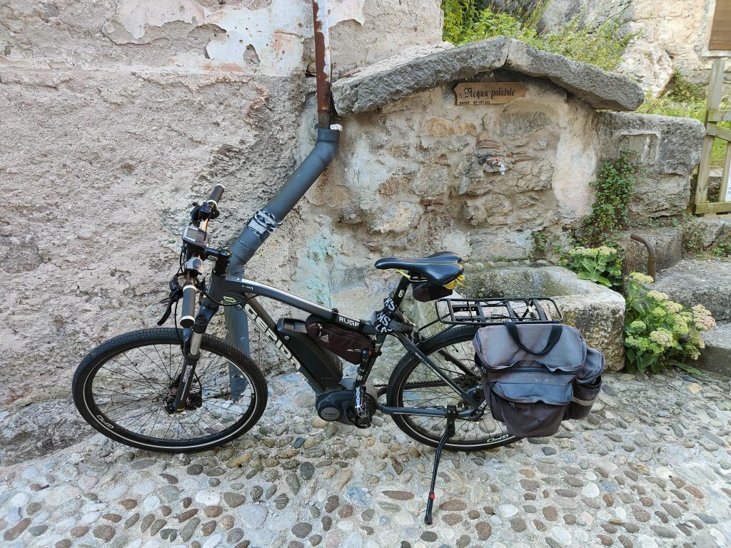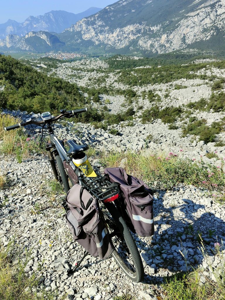 Sono le 07,00. E’ una mattina fresca, non tira un alito di vento (da nord) e l’Ora (da sud) ovviamente non s’era ancora alzata. La gente e i ciclisti non sono ancora sulle strade. Da Riva del Garda con la mia “vecchia” mtb del 2006 (peso 25 km, batteria da 500, motore con potenza limitata, adatta per pedalatine in città) pedalo fino ad Arco per la strada più diretta, più corta: devo risparmiare energie e tempo per la salita che mi attende. Appena fuori dalla città infatti una rotatoria 100 m oltre la quale prendo a destra in Via A. Maino e dopo 300 metri a sinistra: attraverso le belle casette della località S. Martino (un cartello avverte che “in questo paese i bambini giocano ancora per strada”: prudenza, quindi!) e dopo un duecento metri, a destra, inizia la mia salita: 5 km di una stradina molto stretta con una pendenza che spesso è a due cifre.