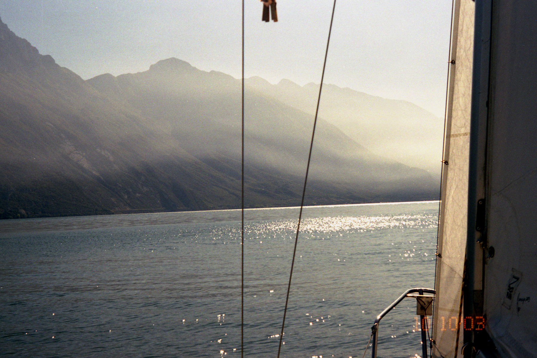 Per caso, con la coda dell’occhio sinistro vedo avanzare colonne di aria e spuma bianca alte cinque metri. Vedo anche che Gianni, fulmineo, ammaina la sua randa. L’unico ad essere riuscito a fare ciò. In un secondo la sventolata mi è addosso. E’ come essere investiti dallo spostamento d’aria di un’esplosione. Impressionante infatti è la velocità e la forza con la quale l’aria è stata letteralmente sparata giù dalla Valle del Ponale. La visibilità scende a cinque metri. Il Fun si sdraia sul lato sinistro. La sola preoccupazione che ho è per i fulmini e per i danni che potrebbe subire la barca. Lasco le vele (il fiocco sbatte, speriamo che non si strappi!). Lego il boma alla draglia. Ammaino la randa recuperandola dall’acqua. Il Fun si raddrizza. Faccio lavorare il fiocco, al lasco, verso Torbole (credo).