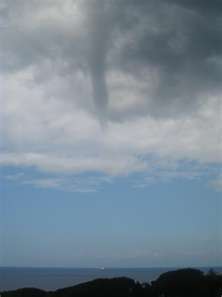 Mini ciclone estivo. Si forma con la stessa tecnica dei veri cicloni asiatici, in caso di forte surriscaldamento dell’acqua. Si crea una colonna di aria calda ascendente che si invortica come una vera tromba d’aria. Più probabile a fine agosto, si verifica una volta ogni due anni circa. Dura una decina di minuti. A terra sradica alberi e solleva catamarani. A mio avviso è assai meno pericoloso per le barche in navigazione, purchè non siano sotto costa e siano a secco di vele. Cosa fare? Quando avvertite troppo caldo, una strana elettricità nell’aria, una forte umidità , una calma irreale, quando il cielo è cupo pur essendo sereno … be’ allora ammainate tutte le vele, accendete il motore, mandate donne e bambini sottocoperta, indossate il giubbotto e allontanatevi dalla costa. In pochi minuti tutto sarà passato senza danni a cose e persone. Direi che i pericoli maggiori in questo caso li corre chi è sulla terra ferma in quanto rischia di essere colpito da piante divelte o da oggetti fatti volare per l’aria, non chi è in mezzo al lago.