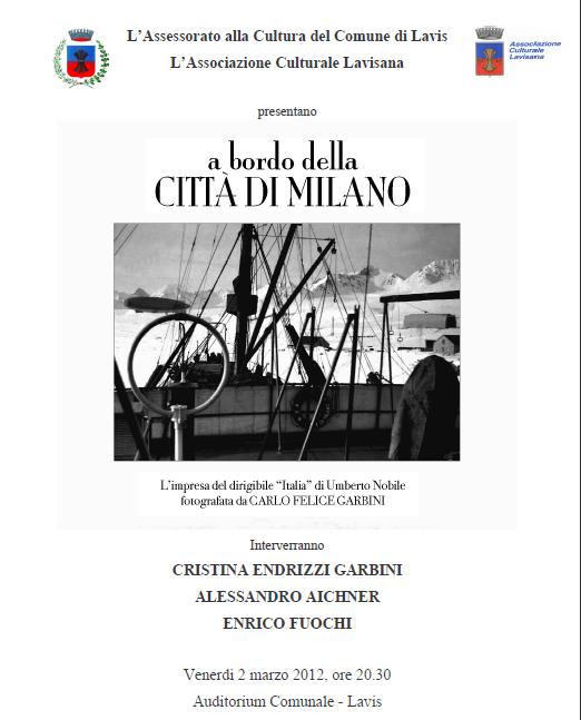 Anche se come ti ho detto non smuoviamo folle oceaniche. Un dato confortante è che negli ultimi anni abbiamo ricevuto un discreto numero di richieste di iscrizione da parte di persone che hanno visto cosa facciamo e che hanno deciso di dare una mano. Questo ci ha permesso di ringiovanire l’associazione e di portare forze fresche, nuove idee ed entusiasmo. A questo punto non mi resta che invitare tutti a consultare il nostro sito e a venire al nostro prossimo appuntamento fissato per il giorno 2 marzo alle ore 20.30 presso l’Auditorium della Biblioteca di Lavis per una serata dal titolo “A bordo della Città di Milano – L’impresa del dirigibile Italia di Umberto Nobile fotografata da Carlo Felice Garbiniâ€. Interverranno Cristina Endrizzi Garbini, Alessandro Aichner, Enrico Fuochi.”