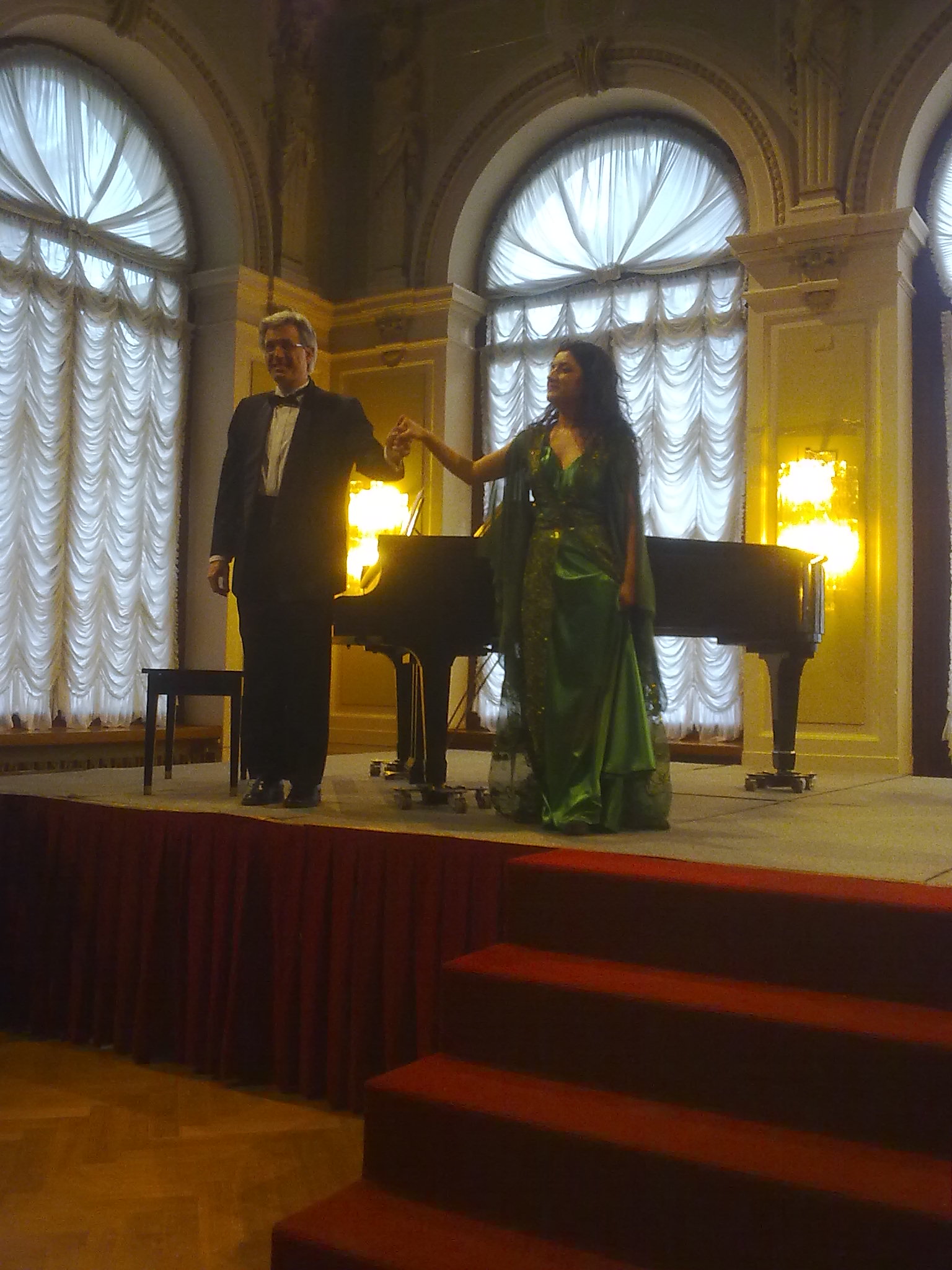 Splendidi i costumi delle due Donne (Dominae) sul palcoscenico. Bella, veramente bella l’intonazione del soprano che ha mostrato di cogliere il calore e la simpatia con la quale il pubblico della sala l’ha accolta ed ascoltata. Chiara, forte, avvincente, convincente e precisa la voce, la vis scenica e l’accattivante simpatia del baritono. Ottima la scelta delle arie. E poi, che dire del rinfresco a fine concerto? Dicevamo … non di sole cose materiali vive l’uomo … ma un brindisi ce lo mise anche Verdi nella sua Traviata, e che brindisi! E noi siamo fedeli alle tradizioni.