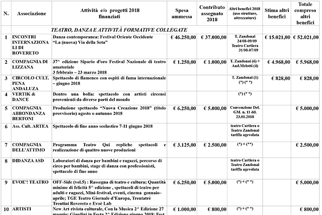 Ea�� in pubblicazione oggi la delibera che dispone i contributi alla cultura. Le domande pervenute, prese in esame ed istruite dall’Ufficio Cultura sono state n. 42. La proposta di ripartizione dei contributi A? stata determinata secondo quanto disposto dal regolamento relativo alla concessione di finanziamenti ad enti ed associazioni ed A? stata effettuata considerando la natura e il valore culturale delle iniziative proposte, i costi generali previsti per la��attivitA� 2018, il disavanzo, la spesa ritenuta ammissibile relativamente alle iniziative ammesse a finanziamento.