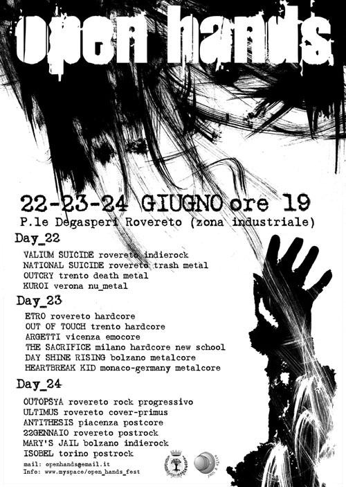oPEN hANDSTre serate di suoni ruvidi, ruvidissimi ma senza dimenticare indierock e dintorni. Sono quelli proposti da Open Hands il festival roveretano che si svolgerà da giovedì 22 a sabato 24 giugno nella cornice del Bosco della città, in piazzale Degasperi Rovereto (zona Industriale). Openhands sarà articolate in diversi generi musicali, in particolare il sabato sarà dedicato a sonorità più accessibili (postrock-indierock), mentre gli atri due giorni saranno investiti da sonorità più dure e viscerali, classiche del festival in tutte le sue sfaccettature (emocore-hardcore-metalcore-postcore). Il festival vedrà la partecipazione di gruppi della regione (Rovereto, Trento, bolzano) e band extraregionali provenienti da diverse città del nord Italia. La prima serata di Open Hands vedrà sul palco “Out of touchâ€? band di Trento rivelazione hardcore old school fra energia e velocità), i roveretani “Etroâ€? paladini dell’hardcore veloce, Season Industry, con il loro emocore personale e intenso e i vecintini Argetti anche qui emocore oriented fra melodia e raffinatezza. Suoni pesanti nella giornata di venerdì 23 con National Suicide, The Sacrifice, In/Out con il loro postcore esistenziale e viscerale, Day Shine Rising, Heartbreak Kid. Sabato 24 a chiudere Open Hands, Outopsya con il loro rock progressivo e psicadelico, Millestoria, Utlimus, Antithesis, 22 Gennaio, Mary’Jail e Isobel. Il tutto senza dimenticare che Openhands guarda anche oltre la musica con una grande capacità propositiva che abbraccia valori positivi che spaziano dal vegetarianesimo, all’etica del consumo responsabile, al rispetto del diverso insieme ad una nuova sensibilità per gli animali e l’ambiente. Anche per questo nell’ambito del ristoro, ci sarà uno spazio dedicato anche a menù vegetariani e vegani.