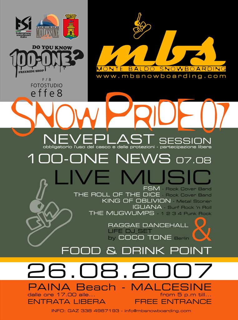 La crew del Monte Baldo Snowboarding A? fiera di invitarvi al primo SNOW PRIDE che si terrA� a Malcesine sul Garda, piA? precisamente a Paina beach domenica 26 agosto.