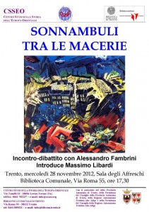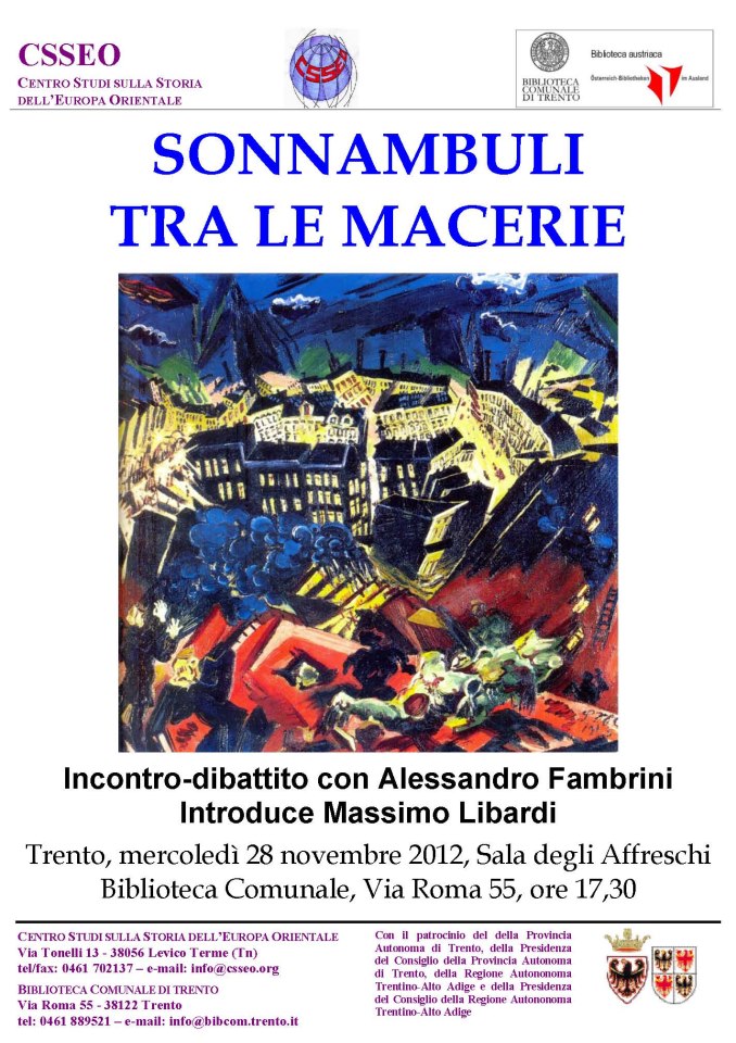 Il Centro Studi sulla Storia della��Europa Orientale e la Biblioteca Austriaca organizzano a Trento, mercoledA� 28 novembre, alle ore 17,30, nella Sala degli affreschi della Biblioteca comunale (Via Roma 55), la��incontro-dibattito Sonnambuli tra le macerie. Interviene Alessandro Fambrini. Introduce Massimo Libardi.