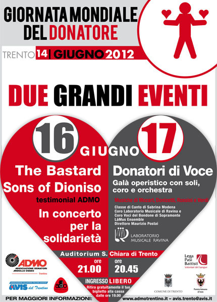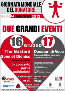 ADMO,A�AVIS,A�AIDO eA�Lega Pasi Battisti saranno presenti in Piazza Duomo da giovedA� 14 giugno per informare la popolazione sulla loro attivitA�. Hanno scelto di festeggiare i donatori conA�gli eroi del rock trentino,A�The Bastard Sons of Dioniso, i quali si esibirannoA�sabato 16 gennaio alle 21.00 presso la��auditorium S. Chiara; la��ingresso sarA� gratuito. Il trio trentino suonerA� i suoi pezzi in onore della donazione, alternandoli a testimonianze di donatori e riceventi.