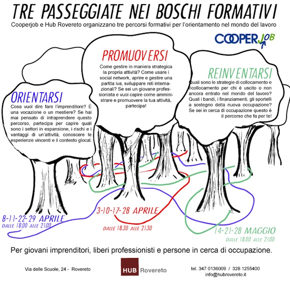 Cooperjob eThe Hub Rovereto organizzano tre moduli formativi di quattro incontri da tre ore ciascuno rivolti a:A�neo-imprenditori, giovani professionisti, over 35 fuoriusciti dal mercato del lavoro. Gli appuntamenti forniranno strumenti e informazioni utili alla��orientamento, alla��inserimento e al reinserimento professionale.