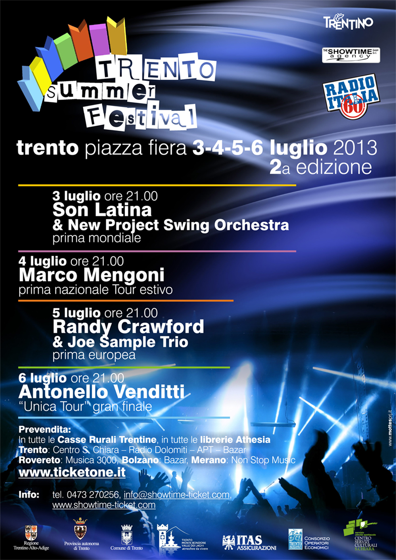 Dopo il resoconto positivo della prima edizione del “Trento Summer Festival” anche quest’anno l’evento avrA� luogo nei primi di luglio in Piazza Fiera a Trento. Come nell’anno scorso il cartellone del “Trento Summer Festival” A? stato pensato per accontentare generazioni e gusti molto diversi:
