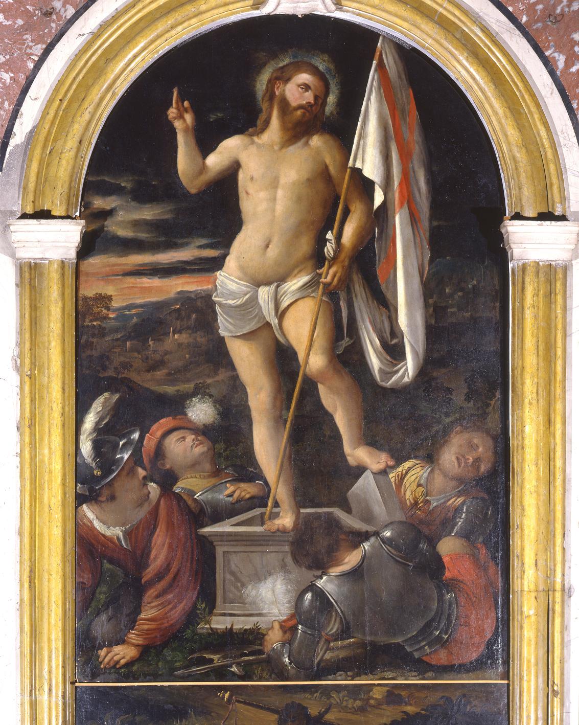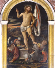 R: Direi che l’opera "star" è sicuramente la decorazione fatta da Romanino qui al Castello del Buonconsiglio per Bernardo Cles: gli affreschi che sono visibili qui a Trento sono sicuramente il cuore pulsante della mostra, anche perchè il restauro che si è da poco concluso li rende oggi apprezzabili in tutto il loro splendore; poi tra le opere di questa esposizione ci sono parecchi lavori da osservare, e forse l’opera più singolare e rivelatrice del temperamento di Romanino è la Resurrezione che viene dalla piccola chiesa di Capriolo – un piccolo centro del bresciano – perchè è un’opera che lui esegue avendo negli occhi un grande modello della pittura aulica del suo tempo, cioè la Resurrezione dipinta da Tiziano proprio per Brescia: in quel dipinto di Capriolo Romanino interpreta in modo assolutamente personale – quasi trasgressivo – il modello di Tiziano, e fa sì che questo Cristo – che in Tiziano è un personaggio elegantissimo che si libra nell’aria con la sua corporatura armonica e perfetta – diventi un uomo qualunque, con i suoi difetti, i suoi impacci, ma con una verità che in fondo ancora oggi ci commuove e ci entusiasma.