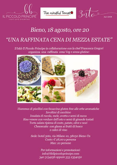 Proseguono gli appuntamenti con le raffinate cene estive veg e senza glutine e la collaborazione con Katiuscia e Stefano del RistoranteA�3nto a Bieno; il prossimo appuntamento sarA� venerdA� 18 agosto alle ore 20,00 a Bieno, appunto.