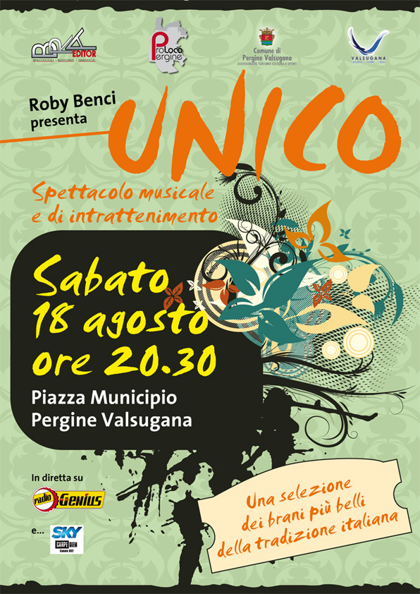 Realizzato con la collaborazione di Pro Loco Pergine, Comune di Pergine Valsugana e la��Azienda di Promozione Turistica della Valsugana, “Unico” regalerA� agli spettatori momenti di bel canto e grande musica e di divertimento, andando in particolare a riscoprire i brani piA? significativi della tradizione italiana, fin dalle sue origini. Roby Benci proporrA� infatti uno spettacolo canoro arricchito da numerosi aneddoti spiritosi provenienti dalla sua esperienza di artista nonchA� una nutrita carrellata di episodi relativi al mondo della musica.