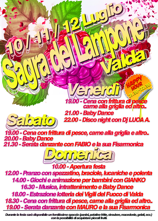 Da venerdA� 10 luglio a domenica 12 luglio, presso il Piazzale Pradi a Valda, alta Val di Cembra, il Circolo Culturale Ricreativo di Valda, organizza la tradizionale Sagra del Lampone.