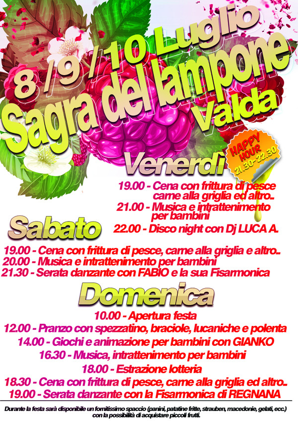 Da venerdA� 8 luglio a domenica 10 luglio, presso il Piazzale Pradi a Valda (Altavalle), alta Val di Cembra, il Circolo Culturale Ricreativo di Valda, organizza la tradizionale Sagra del Lampone.