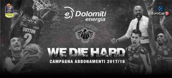 E cosA�A�WE DIE HARDA�sarA� il claim della nuova campagna abbonamenti che partirA�A�martedA� 18 luglio: le nuove tessere saranno disponibili ed acquistabili esclusivamenteA�presso l’Aquila Basket StoreA�in Piazzetta Lunelli 10 a Trento (aperto dal lunedA� al venerdA� 9.00-12.00, 16.00-19.00).