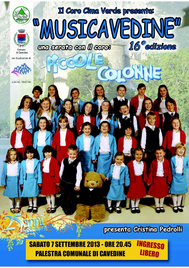 Sedicesima edizione organizzata dal Coro Cima Verde di Vigo Cavedine. Ospiti da��onore sarannoA�il a�?Coro Piccole Colonnea�? di Trento e il Mini Coro Camp FiorA� di Vigo Cavedine.A�Entrambi iA� Cori si esibiranno presso la Palestra Comunale di Cavedine a�� ore 20.45.