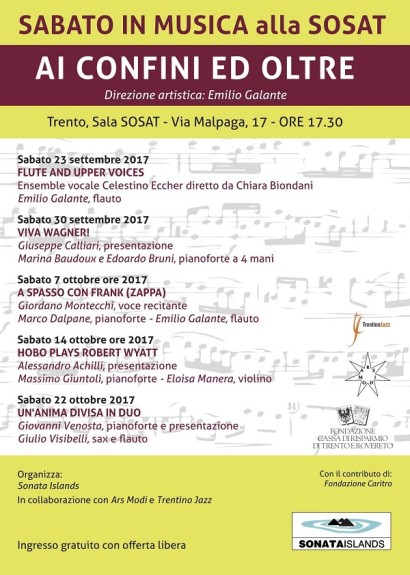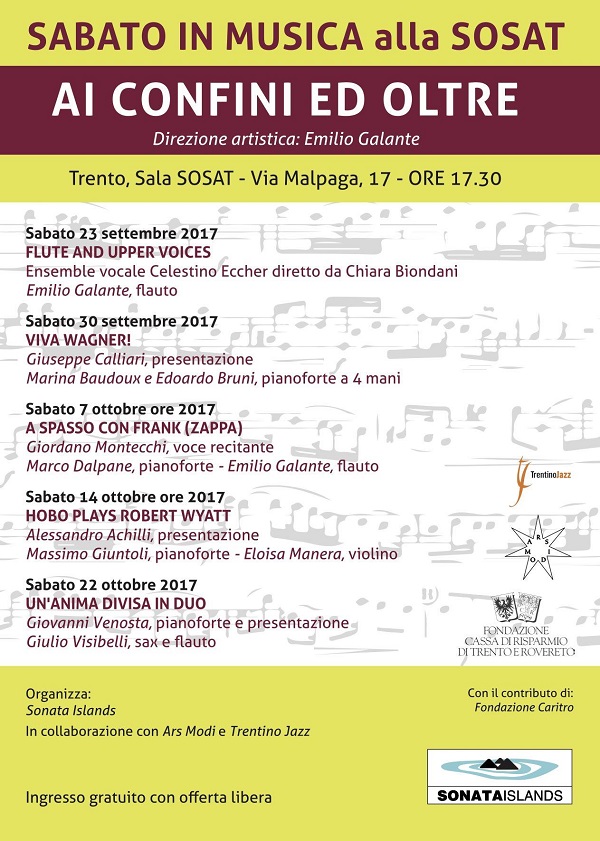 Allego calendario della stagione “AI CONFINI ED OLTRE” ed anche quello di “KATHARSIS 2017”, organizzato da Ars Modi: le associazioni Sonata Islands e Ars Modi hanno collaborato per realizzare presso la SOSAT ben 10 concerti, tutti il sabato pomeriggio alle 17.30, dal 23 settembre al 9 dicembre, riuniti in un unico cartellone “SABATO IN MUSICA ALLA SOSAT”. Il tutto A? realizzato grazie al contributo di Fondazione Caritro, Regione Trentino Alto Adige, Provincia Autonoma di Trento, Comune di Trento, Cassa Rurale di Trento.