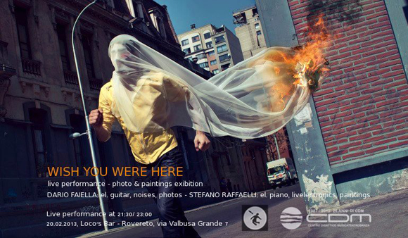 MercoledA� 20 febbraio 2013 ore 21.00 presso il Bar Loco’s a Rovereto si terrA� l’evento “WISH YOU WERE HERE“, Jazz/Electronic live performance/photo & paintings exibition con Dario Faiella, electronic guitar, noises, photos, e Stefano Raffaelli, electronic piano, livelectronics, paintings.