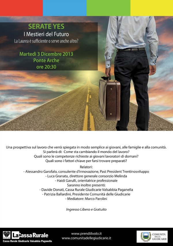 Nella��ambito del progetto YES, La Cassa Rurale organizza, in collaborazione con la ComunitA� delle Giudicarie, quattro serate di workshop sul lavoro giovanile, su come muoversi e orientarsi in questo mondo in continuo cambiamento.