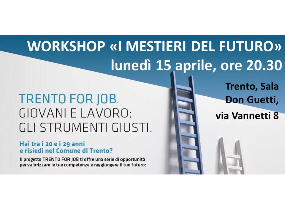 Nella��ambito del progetto Trento for Job, il Comune di Trento e la Cassa Rurale di Trento in collaborazione con i Giovani Soci della Crt e JobTrainer, incontrano il mondo dei giovani affrontando concretamente il tema del lavoro attraverso un Workshop serale dal titolo I mestieri del futuro a��