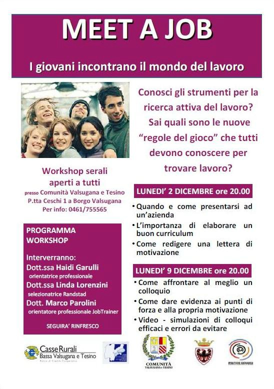 Il Piano Giovani di Zona Bassa Valsugana e Tesino, in collaborazione con la ComunitA� Valsugana e Tesino, la Cassa Rurale Bassa Valsugana e Tesino e il B.I.M. del Brenta, promuove il progetto MEET A JOB a�� I giovani incontrano il mondo del lavoro con la��obiettivo di sostenere i giovani del territorio nel conoscere e affinare gli strumenti concreti di ricerca attiva del lavoro: il curriculum vitae, la lettera di motivazione e il colloquio di lavoro.